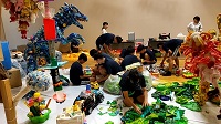 藤浩志氏は秋田公立美術大学の教授で、国内外で個展を開催し活躍する現代アーティストです。今回の出品作《めぐるいきものもり》は、子どもたちから集めたいらなくなったおもちゃを素材に用いて、空間アートを作り上げています。この空間作りを通じて環境問題や消費社会の問題点を知る機会にしてほしいと思います。
