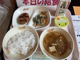 提供した献立は、ごはん、牛乳、メンチカツ、もやしのカレー和え、芋煮、ラ・フランスゼリーです。