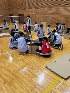 高校2年生が講師となって、避難所設置体験として、ダンボールベッドを作りました。