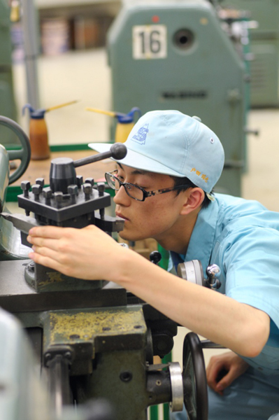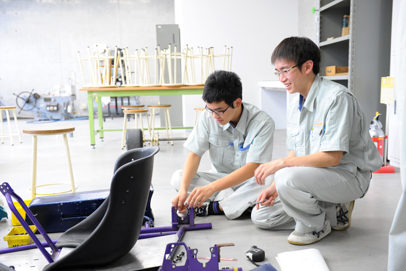 機械の設計、加工から生産管理に至る体系的な仕組みやロボット制御に関する基本的な知識と技術及び情報に関する技術を身に付けさせ、機械設計、工作、生産管理の業務に関する技術者として必要な能力と態度を育てます。 また、機械や情報系の工学大学への進学にも対応できるようにします。 バッテリーカーの組み立て 作業の様子